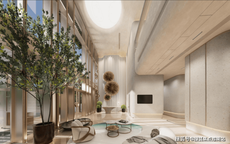 进入一层单元入户大堂,双层挑空约9米。室内的设计风格同样延续了外立面流动波浪的理念,以曲线营造空间质感。