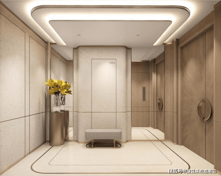 标准层电梯厅中,主厅地面均为石材,3D弧形墙面,吊顶曲线与地面呼应,以品质细节,进一步深化仪式感。