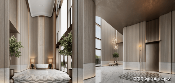 墙面地面石材通铺,圆弧形纹理的吊顶再次呼应整体曲线设计语言,搭配暖色灯光和大面积落地窗,电梯时间同样满眼绿色。