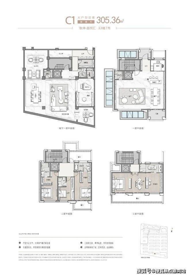 户型设计:联排别墅为地上三层,地下两层设计,约10.7米大面宽,6米挑高地下室,南入户边套地下室为三面采光,中间套为双面采光。一层是会客区,可配置老人房;二层休息区可做到全朝南3房,部分户型有双套房设计;三层是主人私享区,有书房、衣帽间、主卧及露台。
