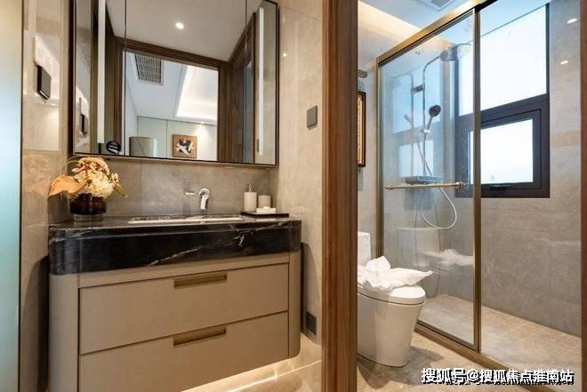 卫生间甄选唯宝的台下盆、汉斯格雅的龙头+恒温花酒,玫瑰岛的淋浴房,科勒的智能一体马桶+浴缸+浴缸龙头等,生活质感肉眼可见。