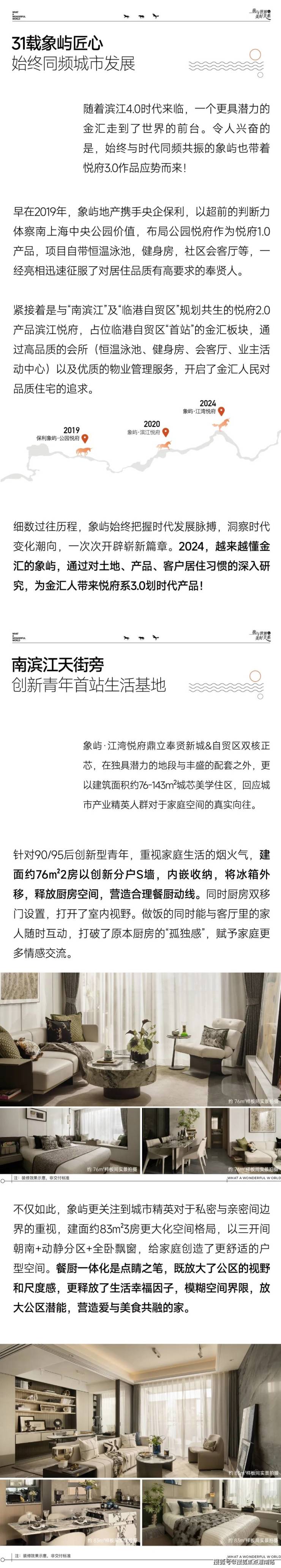 31载国企象屿精耕城市的幸福答卷象屿地产是《财富》世界500强、厦门市属国有企业象屿集团的全资子公司。历经31载,深耕长三角、海西、成渝核心都市圈,业务涵盖地产开发、商业运营、物业服务、工程代建四大板块,已发展成一家有实力、有信赖、有品质、有温度的国资背景实力房企。在深耕沪浙区域的20余年里,象屿打造了一座座 “象屿代表作”。2024年,象屿与时共进,布局产业与生活澎湃向前的奉贤金汇,为城市带来历久弥新的幸福生活向往。