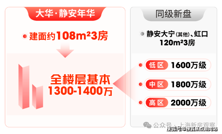 放眼整个静安区,曹家渡17万/㎡,东斯文里和苏河湾项目预计冲击20万/㎡,和大华·静安年华高层差价预计近7万/㎡。旁边虹口新房售价也已达14.78-16.6万/㎡。