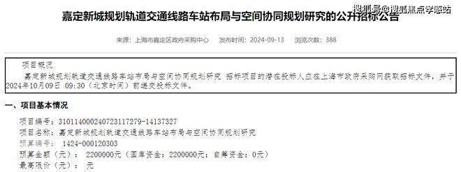 9月13日,上海政府采购网发布《嘉定新城规划轨道交通线路车站布局与空间协同规划研究的公开招标公告》。