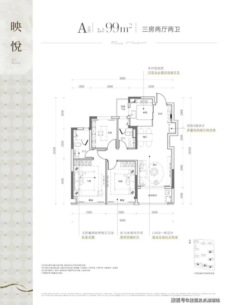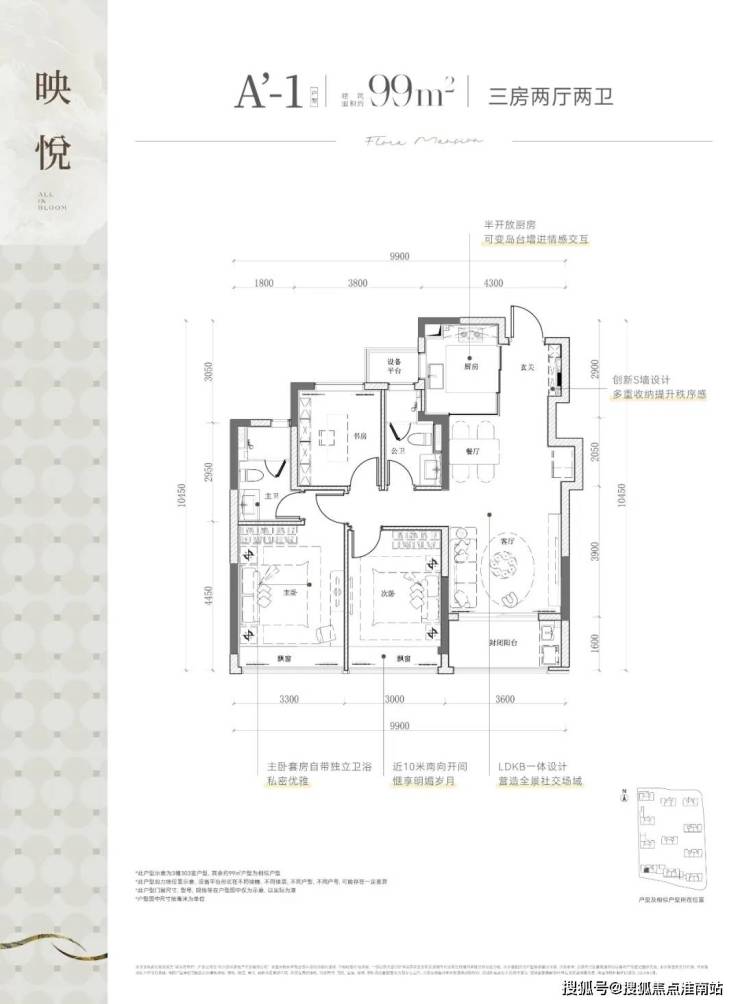 该边套户型,不仅有270度的采光视野,主/次/客卧三大开间并立朝南,“含阳光量”十足。