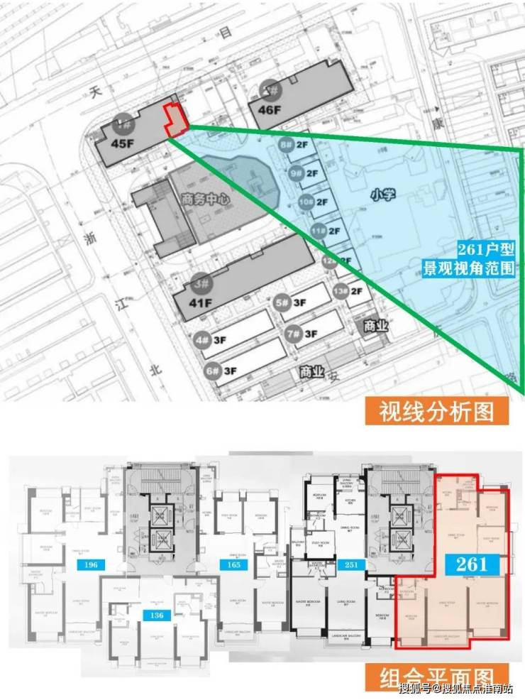 但是 看户型不能光看一个户型平面,还得看它的组合平面,以及在总平面上的位置。如上图,我做了261户型的视角分析。