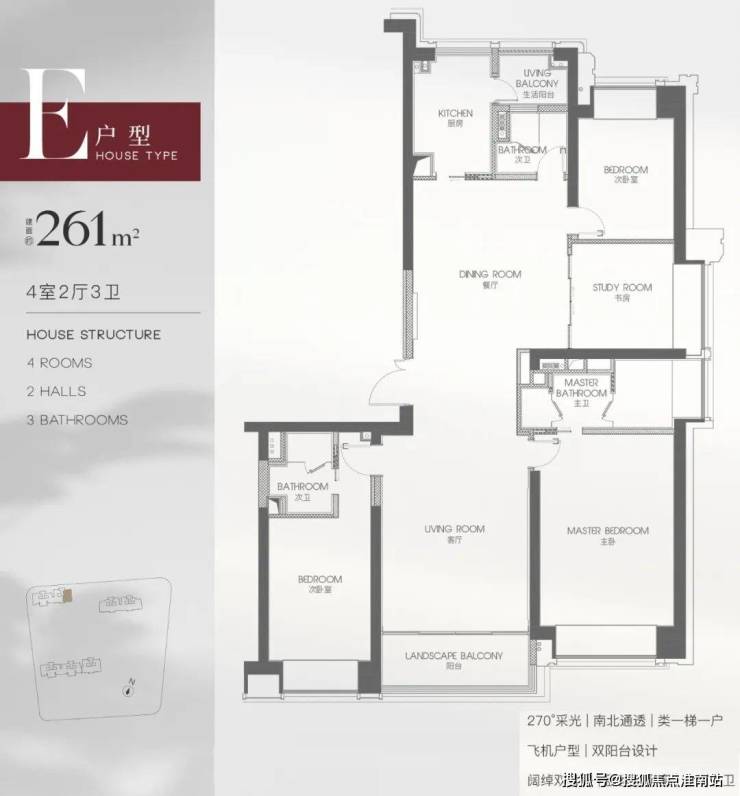 苏河湾1号261平方户型,如上图是一个 4房2厅3卫的户型,3开间朝南。一般这种户型的面积段都在200m2以下,而这个户型的面积是261m2,属于“不太经济”。