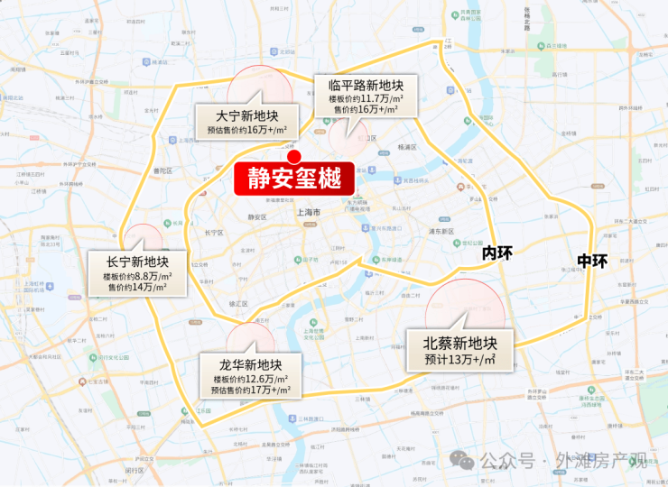 别说静安内部了,扩展到全市,简单看看几大热门板块的新地王,浦东北蔡新地块预计13万/㎡左右、 长宁新地块14万/㎡左右,临平路16万+/㎡、徐汇龙华更是奔着17万/㎡去了,这些中环附近板块3房总价起步就是1500万以上!