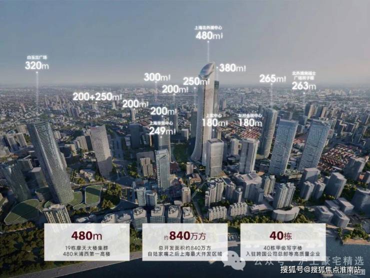 北外滩将建设480米高的浦西第一高楼——上海北外滩中心,未来将携19栋摩天大楼集群共筑上海崭新天际线。