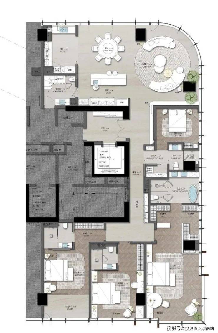 从高档材料的运用到开放式的空间布局,全屋奢石通铺,入户门厅匹配的是纹理低调的超白洞石搭配定制尺寸卡门,一眼看去,安全感满满。进门后,意大利进口石材全屋通铺,每一处地砖流水型纹路都能对应,需要提前至少2年预定的梅西同款进口芬迪白石材被用作电视背景墙,阔绰感不言而喻。