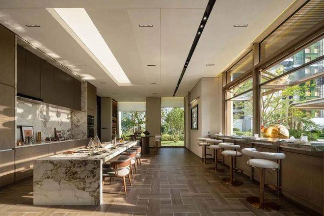 门庭。这里特指单元门庭,通高约4m,气势恢宏。大面积的金属屋檐外挑,彰显贵胄的同时,又扩大遮风挡雨的面积。进门左侧,色彩饱满的普拉达绿竖版镶嵌,美学传达与奢华品质相辅相成。进门后,又是大幅岩板上墙,气质拉满。