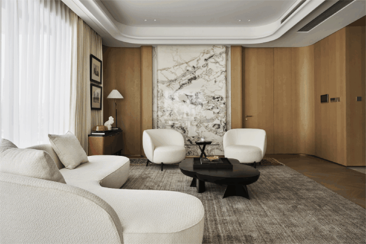 休息区同样是多个曲线元素相互呼应,在宽敞明亮的等候区,迎接友人或舒心归家,才是豪宅应有的无死角体验。