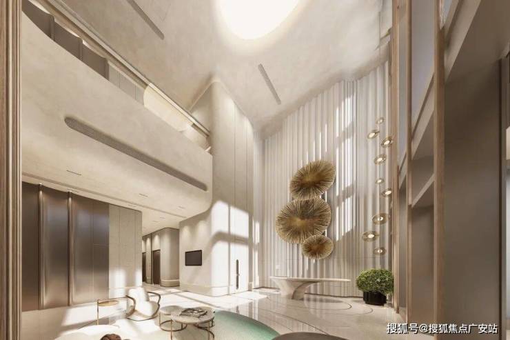 进入一层单元入户大堂,双层挑空约9米。室内的设计风格同样延续了外立面流动波浪的理念,以曲精工彰显空间品质。