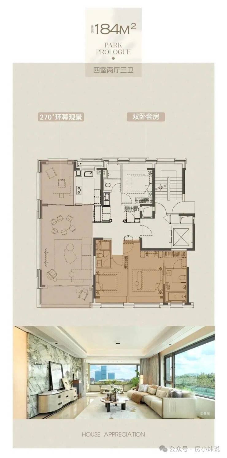 184㎡为楼王户型,拥有7.5米面宽横厅、270°环幕窗景及双套房设计。