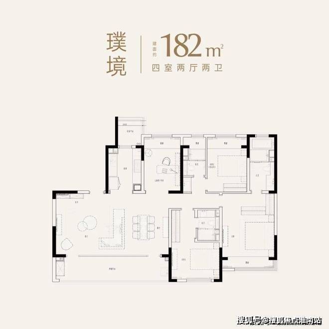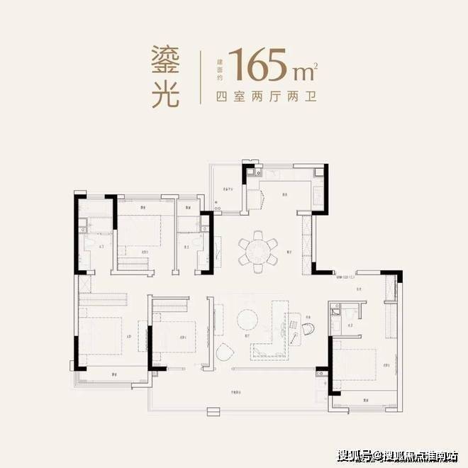 豪华舒适大四房,不同点在于,南向次卧做了套房设计,阳台与大横厅等宽。