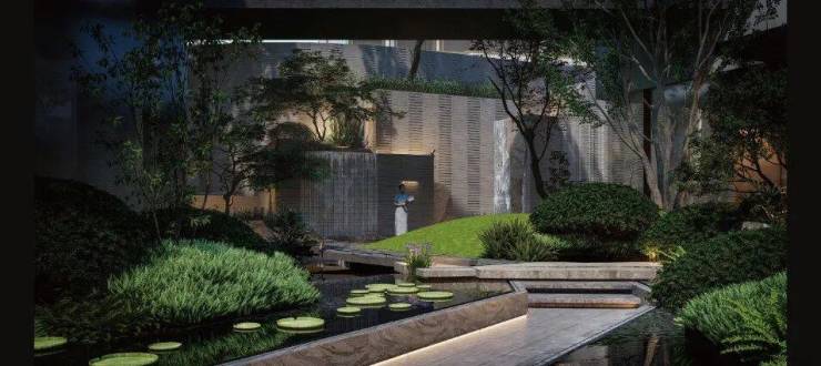 中央水韵庭院以「叠水莲池」为理念打造多层次的水景体系,叠水瀑布形成动态的水流韵律,池畔大理石打造的休憩长桌,成为被绿意环抱的林下空间,氛围相当惬意~