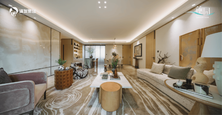 社区园林上定制了两大轴线、五重礼制归家、六大摩登生活场景等。泛会所客厅,可林下赏莲会友。