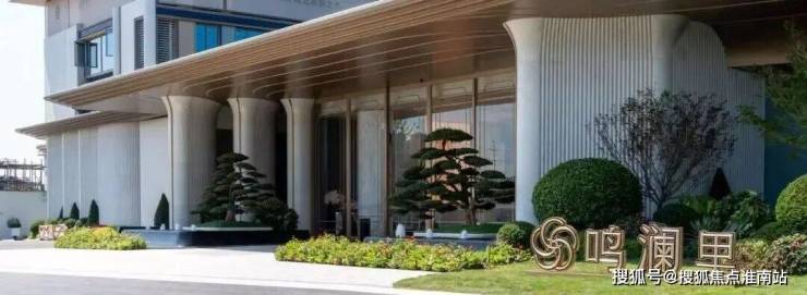 门前两棵罗汉松;园区内的中央园林围绕新型蓝宝石戏水池打造,营造澜韵迎宾、松鸣涧语、鸣泉叠韵、鸣芳拾趣、鸣香径幽等九境空间。