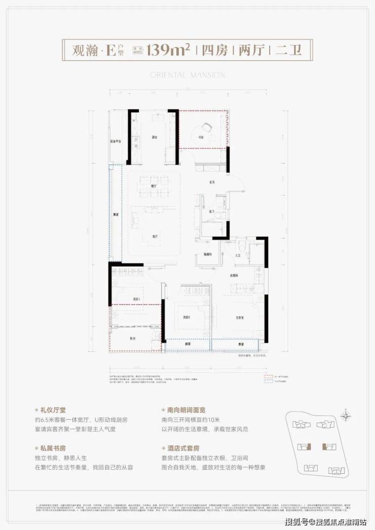 鸣澜里139平户型同样做的不错,打造四房两厅两卫,分为横竖两款,全部为边套,两梯两户设计。其中,139平竖厅户型亮点分析:① 户型得房率超高,达到约93%;② 南向3个卧室,采光优且满足二胎家庭和三代同堂居住需求;③ 客厅面积达到约37平,足够大,同时额外配置约2.6平的储物间。