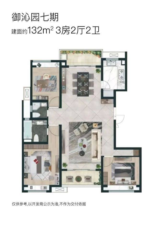 【御沁园】七期将推出3栋18F高层住宅,两梯两户无连廊设计;将推建面约132~172㎡三房户型,其中: