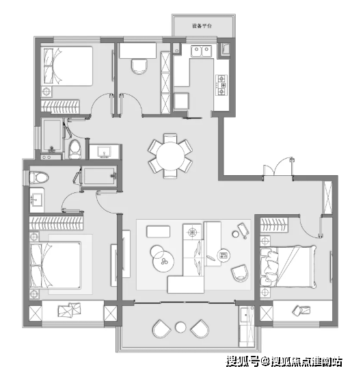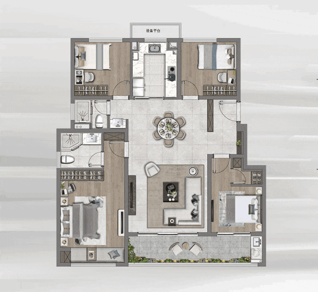 该户型为项目最大户型,超大横厅设计,餐客一体,空间感极佳;主卧带飘窗和独立卫生间,客卫完全干湿分离,生活舒适度较高。