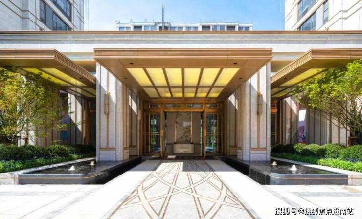 从项目南入口,穿越前厅的潺潺水景,便是与社区建筑完美融合的门厅大堂,其设计简约而不失精致,摒弃繁复细节,彰显出新海派独有的高雅格调。
