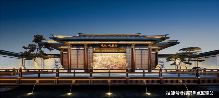 入境观唐,尺度威仪的唐风大门,面宽约40米,高约9.6米,屋顶采用“重檐歇山顶”形式,彰显中式门第尊崇之礼。