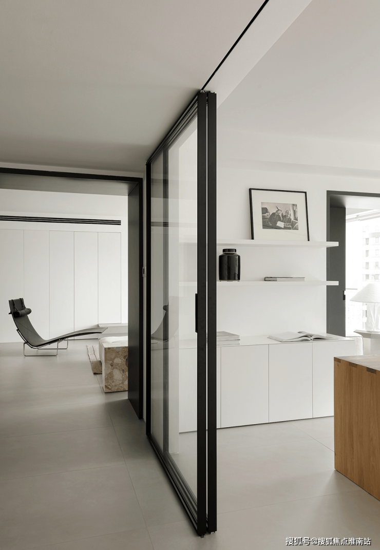 四白落地的墙面,浅灰色混凝土地坪和无主灯设计,让空间更加简洁干净的同时,也为屋主希望‘家’和‘画廊’空间的结合成为可能。