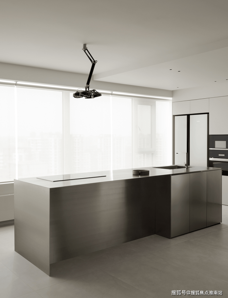 开放式的不锈钢岛台面向28层的城市全景而坐,窗外的摩天大楼和建筑物脚下熙熙攘攘的车水马龙尽收眼底。