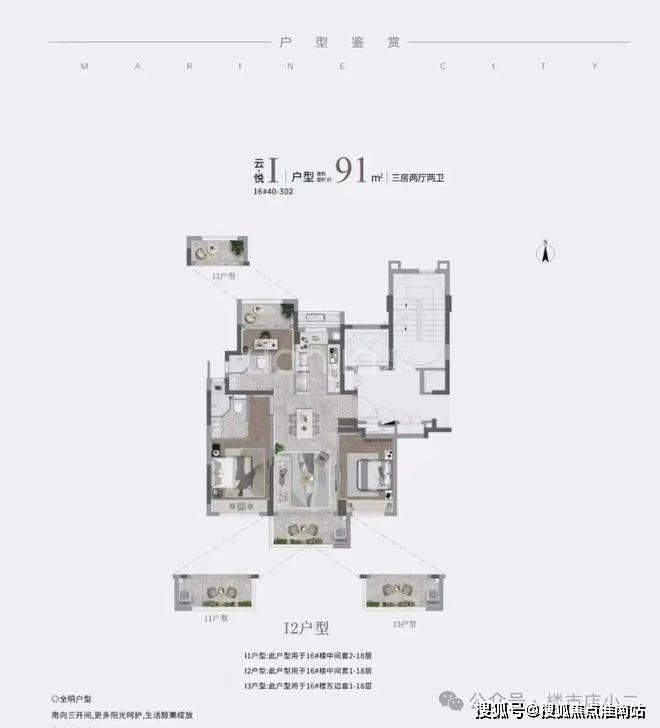 建面约91平方米的三房两厅两卫户型,备案价总价区间为383万到460万元.这一户型采用三开间朝南的飞机户型设计,客餐厅厨一体化布局,搭配大尺度观景阳台.打完折315万起