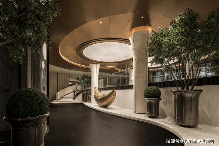 庭院中央核心,是一汪深邃的「宇宙之心」漩涡水景,其设计灵感源自梵蒂冈博物馆的螺旋楼梯,仿若宇宙星系流转。