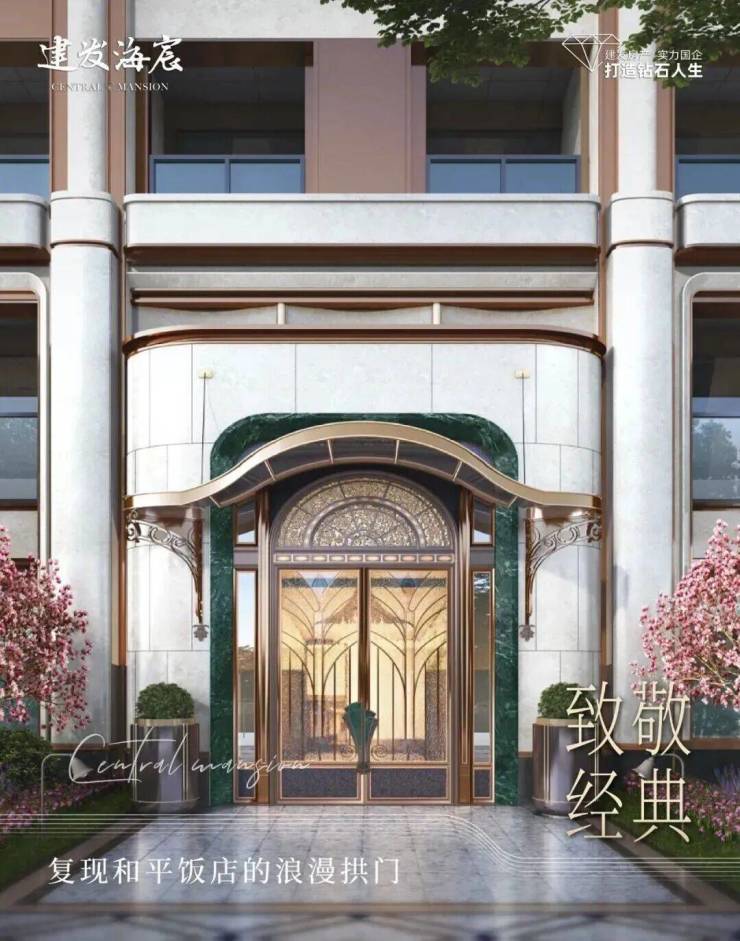 萃取东方色谱精粹,建发·海宸甄选丝箔流金、东方雅铜,青釉奢蓝,以当代笔触晕染立面,令传统色彩在空间生长为永恒的诗意,「入户门头」形取和平饭店经典拱门,配以碧绿色天然石材门套、彩玻花窗,重现百年外滩门廊的尊崇仪式。