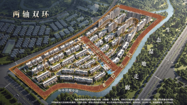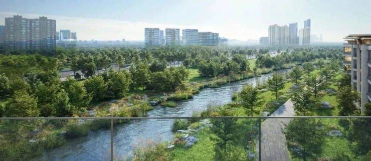 地块更是先天禀赋出众,三面被绿地与水系环抱,东侧依次排布滨河景观带、城市公共绿地与生态走廊,层层递进,自然景致连绵不断。