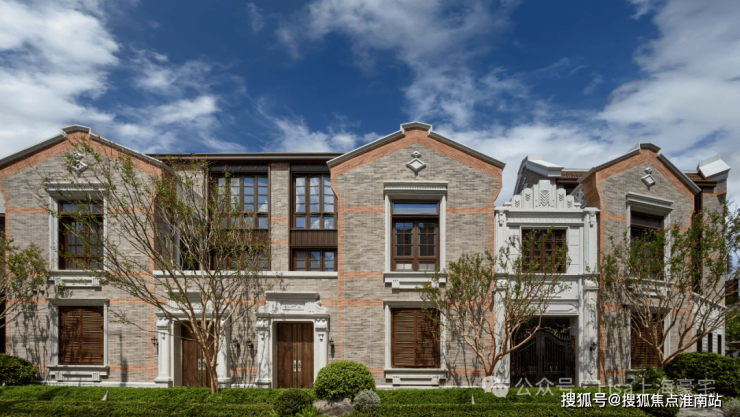 而在与砖连接的窗体,保利永兴里别墅的窗框及四周采用了仿木纹铝型材和铝板,门窗套为浅色石材。
