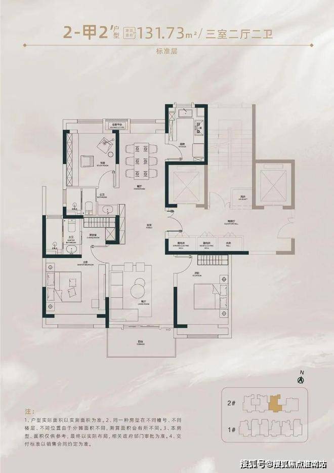 建面约131㎡小高层户型,实得面积可媲美约140㎡户型的阔绰空间。