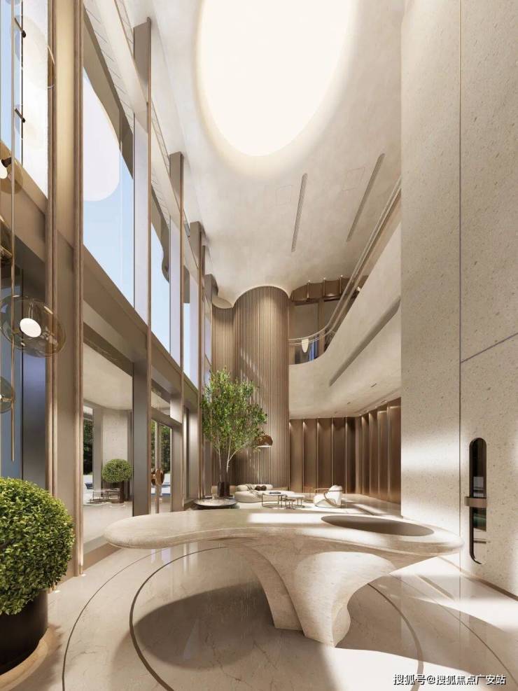 进入一层单元入户大堂,双层挑空约9米。室内的设计风格同样延续了外立面流动波浪的理念,以曲精工彰显空间品质。