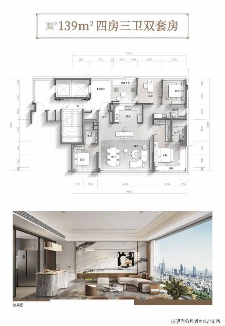 保亿君潮润府139㎡4房3卫户型做到四室三卫的同时室内实际空间使用率高达97%,南向面宽约14米,客厅6.8米南向面宽;连接北侧的书房、北阳台、私家电梯厅,可形成一个可以植入更多生活场景的大洄游动线空间