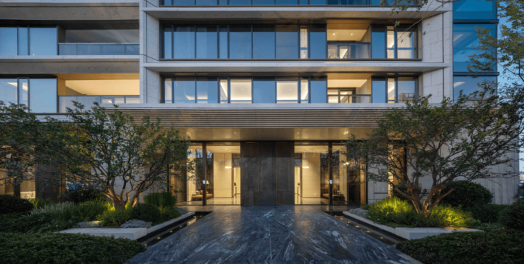 建筑立面上,源自罗伯特・斯特恩古典风格的现代转译,融入蒙迪里安格构手法,以质感石材、鎏金铝板与大面积玻璃的精妙组合,搭配独墅感框景序列,既彰显古典的厚重与尊崇,又兼具现代的简约与通透,成为城市天际线中一道独特的风景。