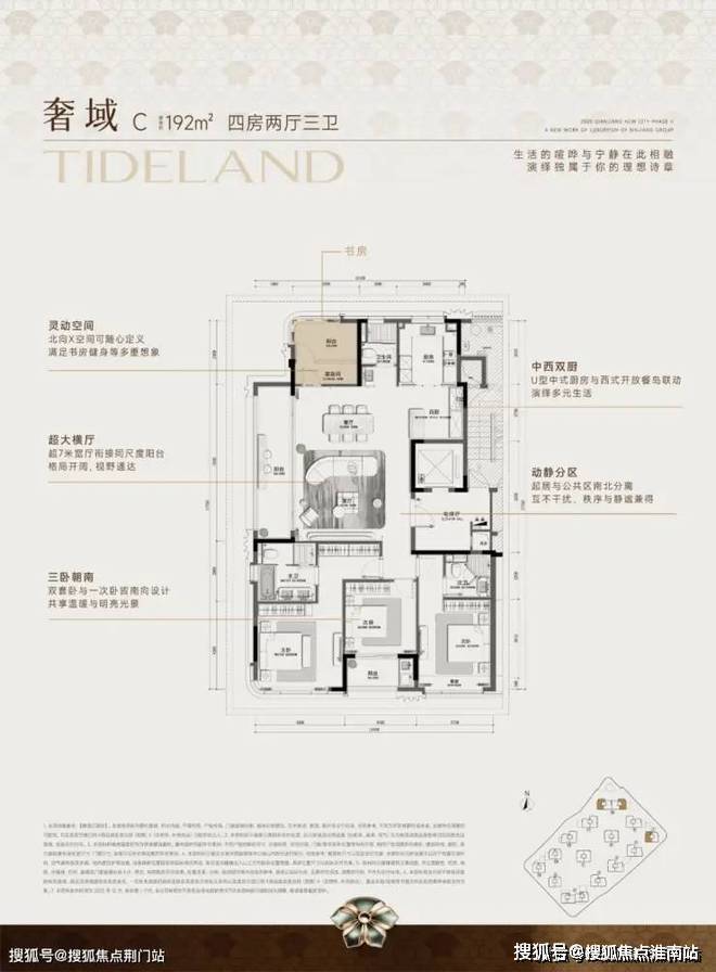 再看192方户型,更注重空间的包容性与场景多元。客餐厅一体化设计达到约49方,配合中西双厨配置,满足家庭聚会与社交宴会的需求。双套房设计增强了家庭成员间的居住私密性,而书房的270°采光面则极大提升了使用的舒适度与通透感。