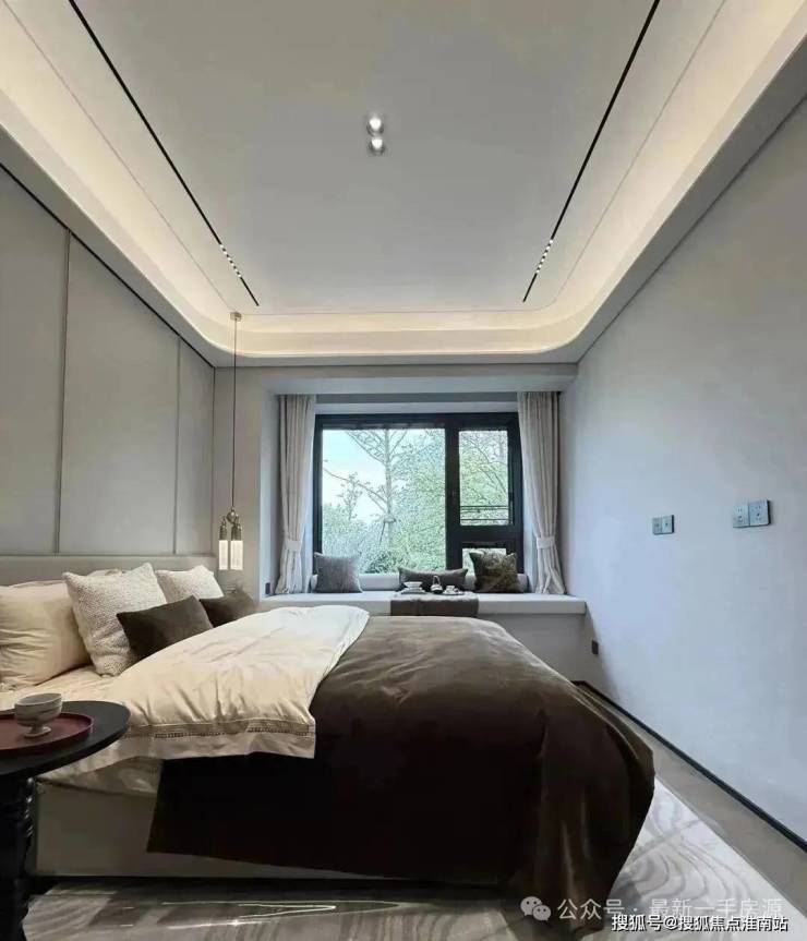 主卧转角落地窗+飘窗,也算是非常少见的了。净面宽约3.6m,不算进门的衣柜,进深大约5.7m左右。根据测算,可以放置宽约2m的床+2个床头柜(宽度约45cm/个)是可以的。