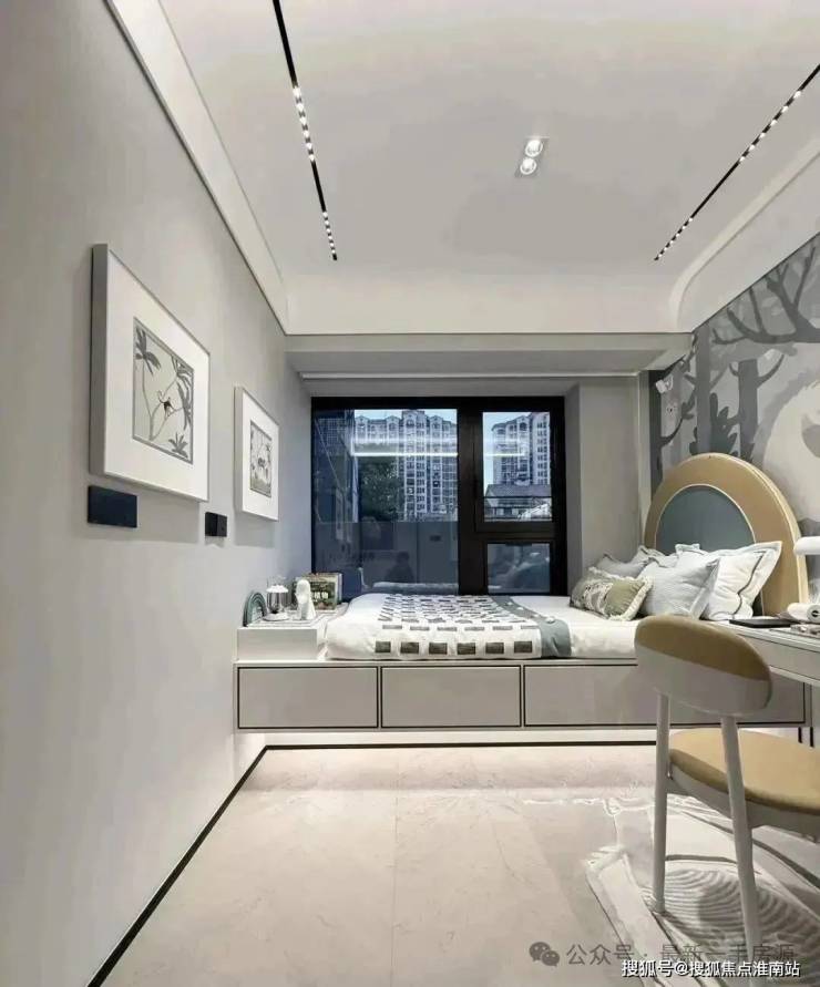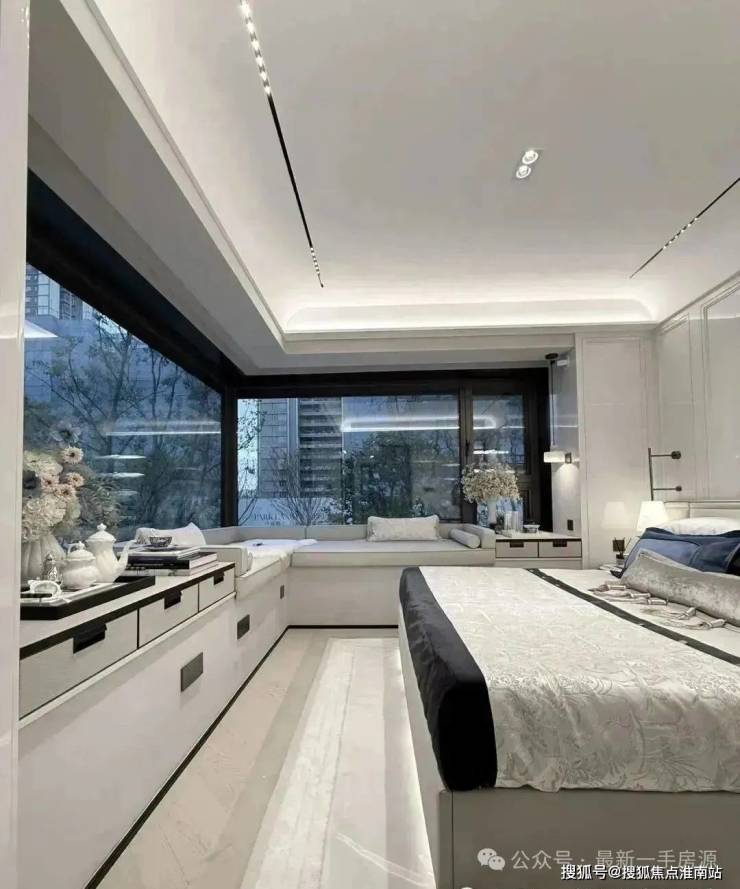 其中主卧的270°转角飘窗就有约5.7m²,通过与外立面的结合,直接做了梳妆台和储物柜,拓展了飘窗的实用性。