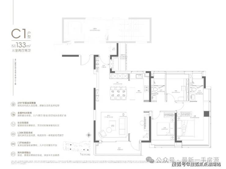 133㎡可以说是108㎡的进阶款,同样的三房两厅两卫,大面宽横厅、半开放式厨房设置岛台,加上主卧L型飘窗,再一次验证了华润置地豪宅化的产品思路。