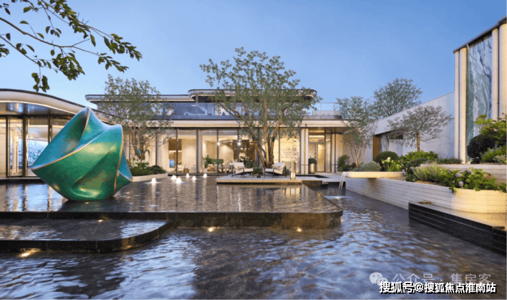 约7米高的主入口,把贝金米黄石材、维多利亚绿等名贵石材,与古铜色金属板、紫薇等名贵草木巧妙搭配、相得益彰,犹如穿着翠绿华服的翩翩公子,透着一身贵气。
