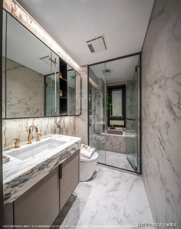 卫生间墙面采用大面积岩板,台盆柜处 定制镀金龙头;另外超大镜面柜内配置了充电口,方便剃须刀、电动牙刷等工具收纳。