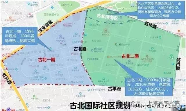 整个古北国际社区可以分为三期,以古北路为界,由黄金城道贯穿,古北路以西为古北一期,以东为二期和三期。