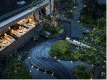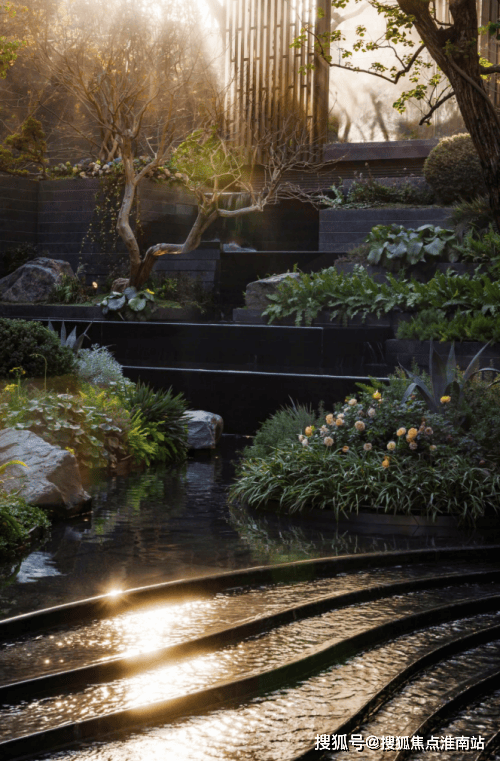 一条永不间断的清渠活水,成就了一场都心山涧的独享;叠级水瀑随形就势,流水从近7米的跌水台层层落下,每一层都营造出不同的绿植场景;山涧的流水与乌桕相映成趣,形成红叶胜花的特有山水意境。