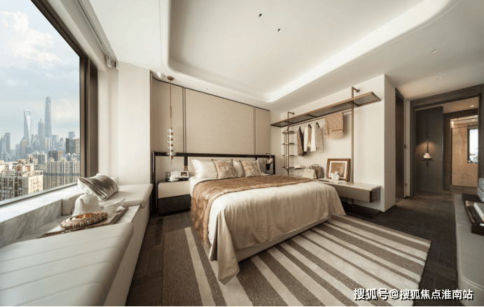 主卧套房内,皮革背景墙内嵌非遗云纹立体墙布,书香门第木地板以回形纹铺就,顶级爵士白飘窗将室内外景致完美融合。此外,六扇门步入式衣帽间,搭配夹丝玻璃门,让空间有序从容