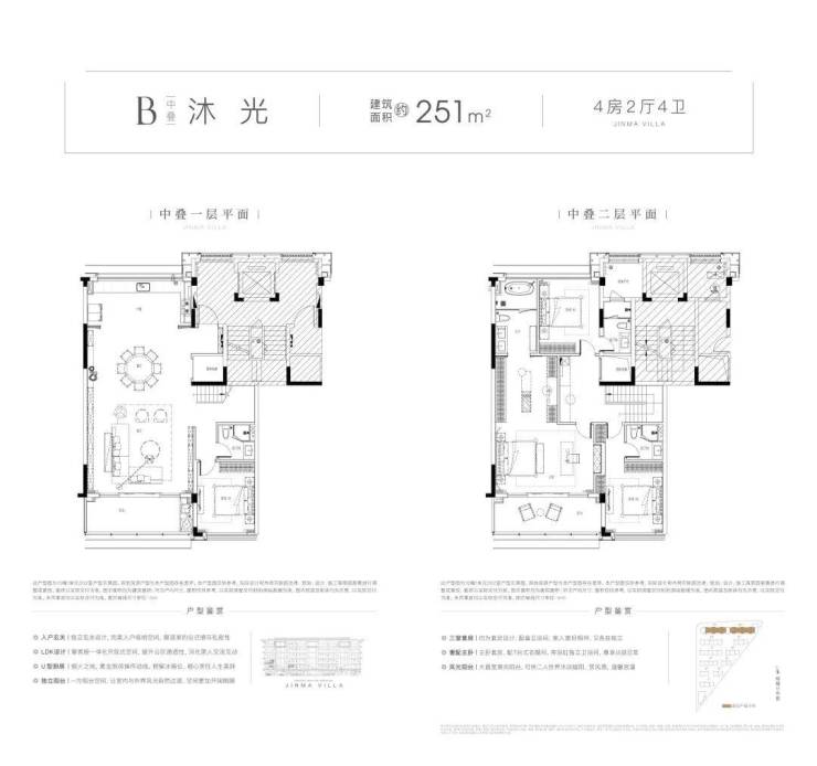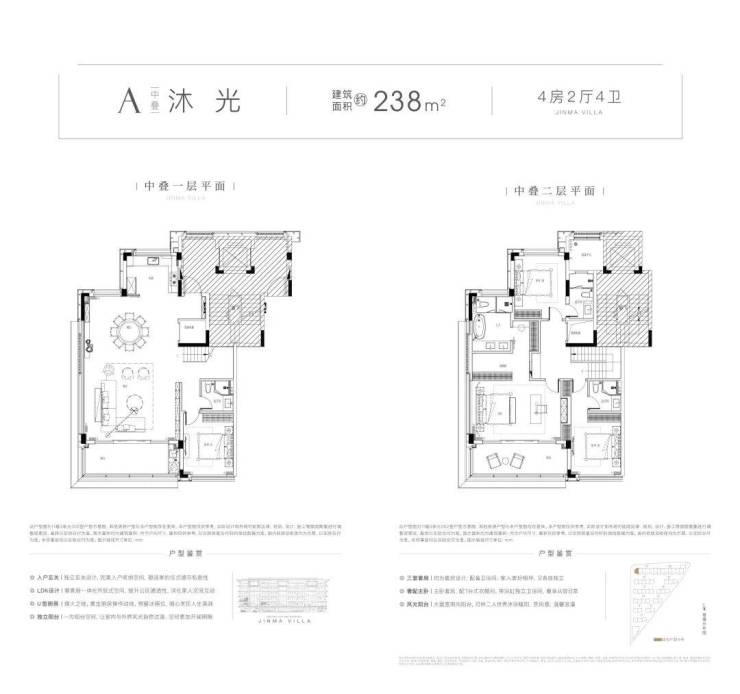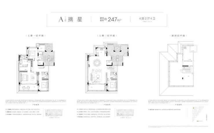 建面约 238-250㎡:上叠 / 中叠,3 房 2 厅 4 卫,主卧套房 + 独立衣帽间,约 120㎡私院