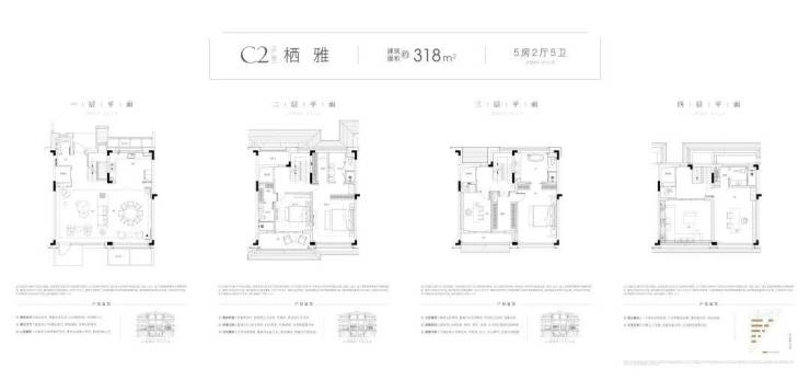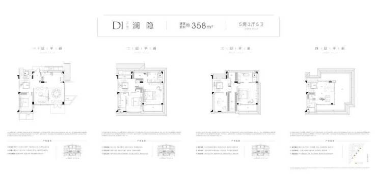 建面约 317-362㎡:联排滨水院墅,5-7 房 2 厅 5-6 卫,三层独栋格局,独立入户花园 + 星空露台 + 地下车库