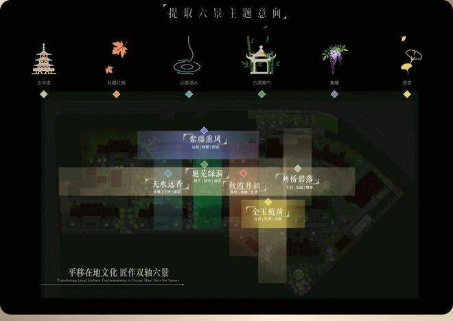 社区内布局“礼序归家轴+景观漫步轴”纵横交织的双轴景观动线,将州桥老街、秋霞圃、远香湖、古猗园、紫藤园、银杏古树等嘉定六景提炼、转译,形成了具有在地文化特色的六大景观主题空间!并以此形成整体约300米的景观纵深,未来将呈现出一个超大的中央公园。